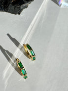 These earrings feature a huggie design lined with green quartz baguettes. The huggy clicks closed making it secure and comfortable. This huggie is 15mm.