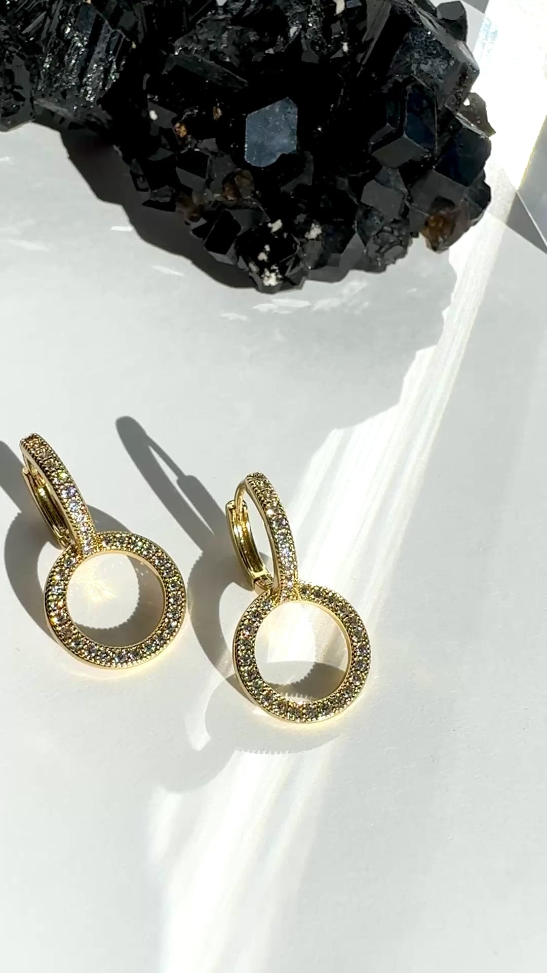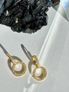 These earrings are the perfect mix of simple and detailed. Two offset stationary pavé quartz circles make up these classic and easy to wear huggie earrings.
