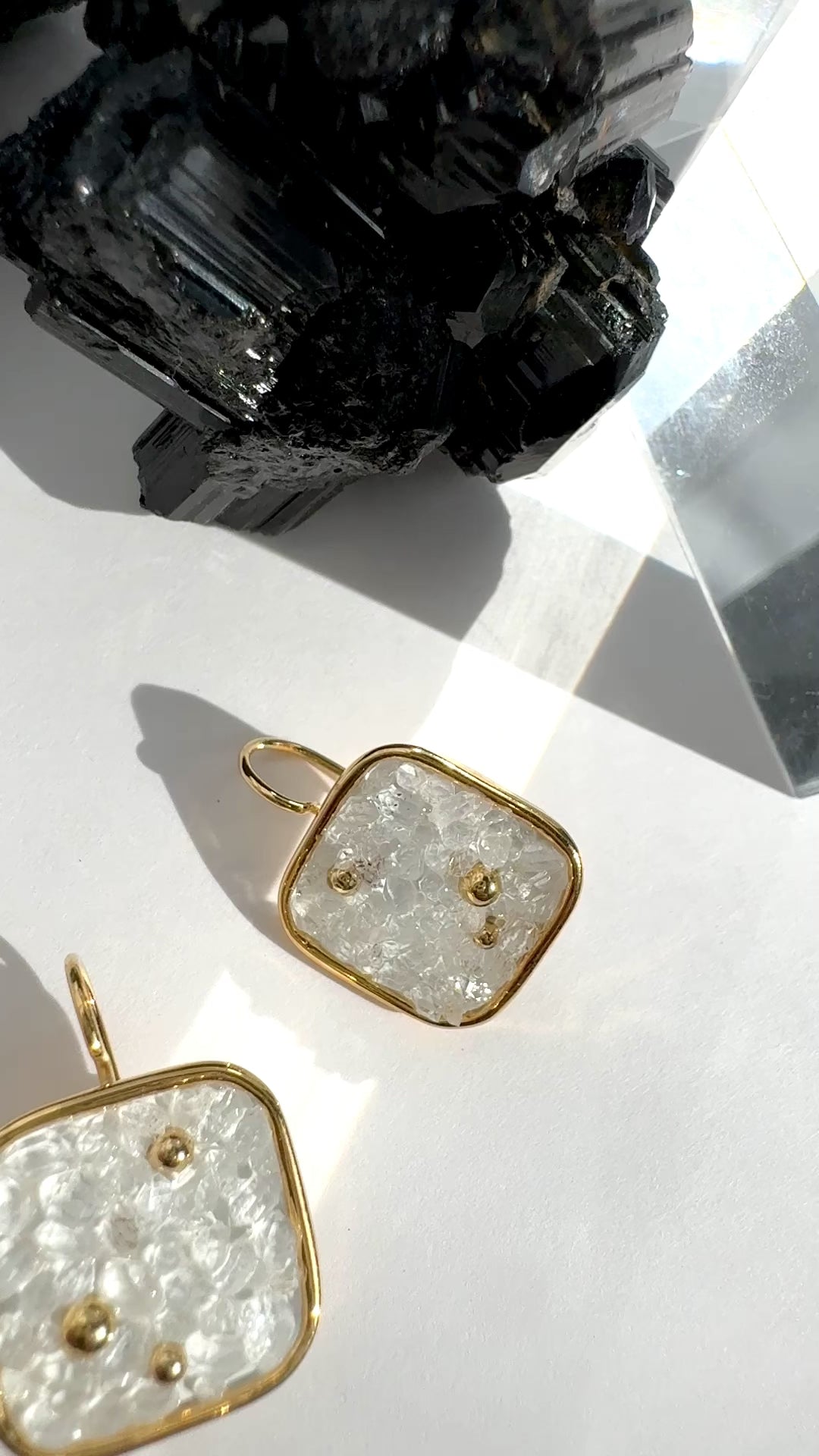 Earrings that stand out for their incredible sparkle and simplicity. A simple drop earrings statement that captures the gleam of individual herkimer diamond quartz stones that have been meticulously nestled together with gold studs in a way that feels classic and modern.