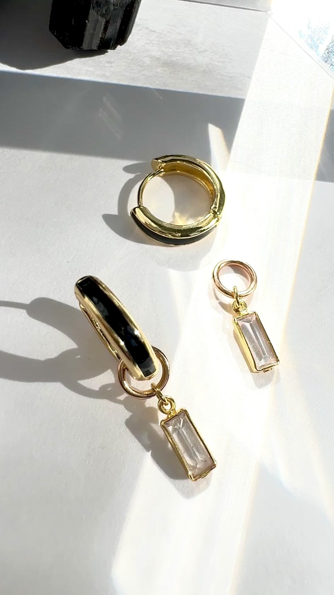 Earrings that can make getting ready easy. These earrings feature a huggy design with a thin black enamel inlay. The huggy clicks closed making it secure and versatile since they can be worn with or without the clear topaz rectangle drops.