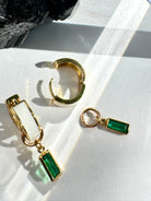 These versatile earrings feature a huggy design with a wide white enamel inlay. The huggy clicks closed making it secure and versatile since they can be worn with or without the green quartz rectangle drops.