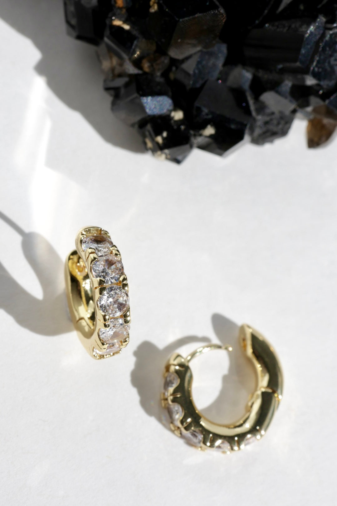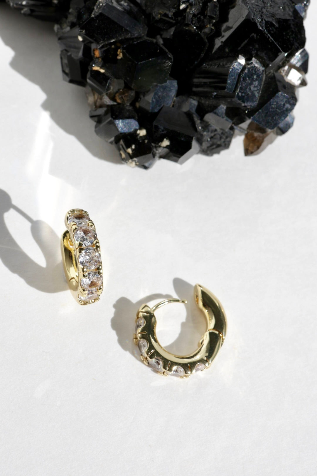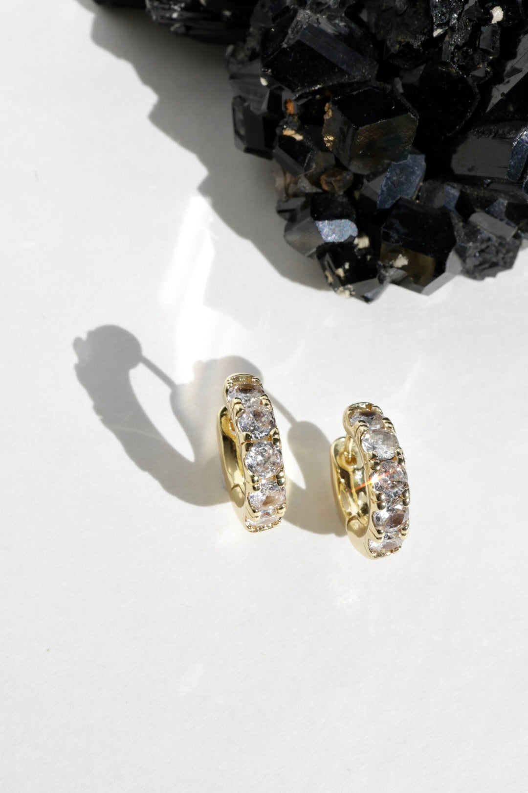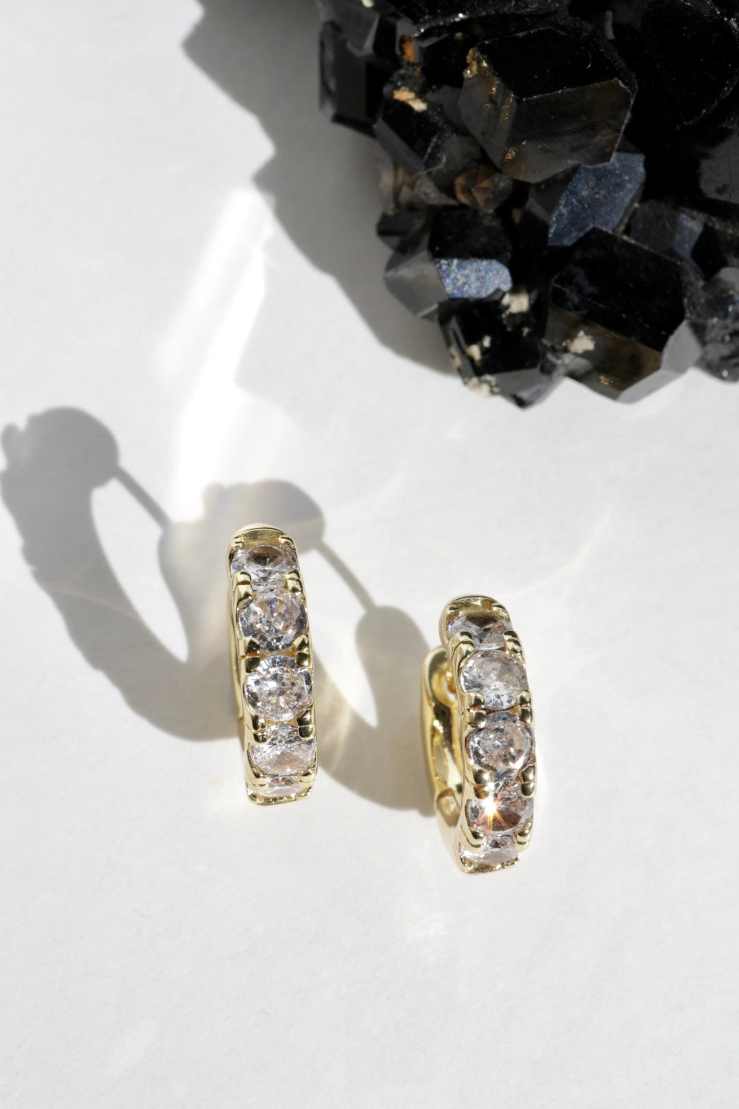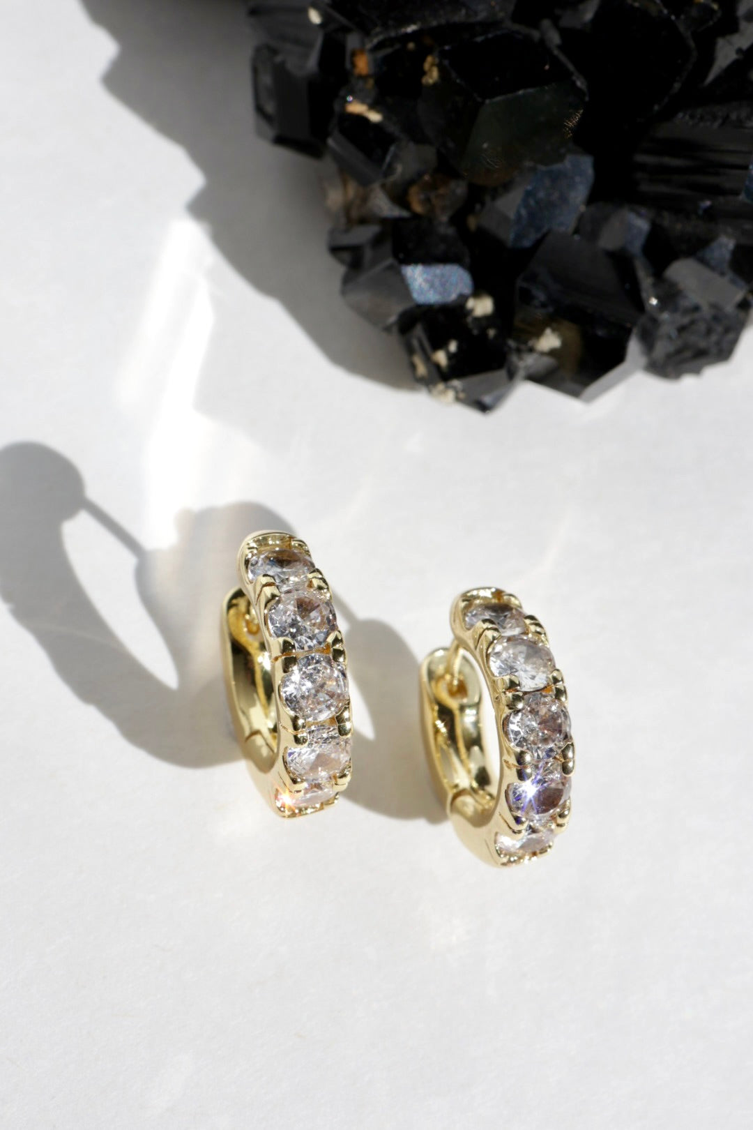 A row of luminous clear quartz stones arcs across the front of each huggie, catching the light with a brilliance reminiscent of diamonds. The faceted stones create a soft, radiant sparkle while the smooth gold silhouette keeps the look clean and modern.