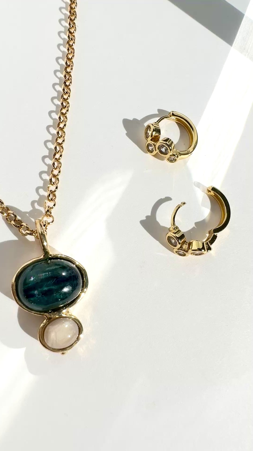 A tall, domed 10.3 carat inky blue kyanite rests above a subtly soft milky grey star sapphire, joined in a harmonious stack that reflects and refracts the light with quiet depth. The pairing feels timeless and grounded—luminous layers of blue and smoke suspended in gold.