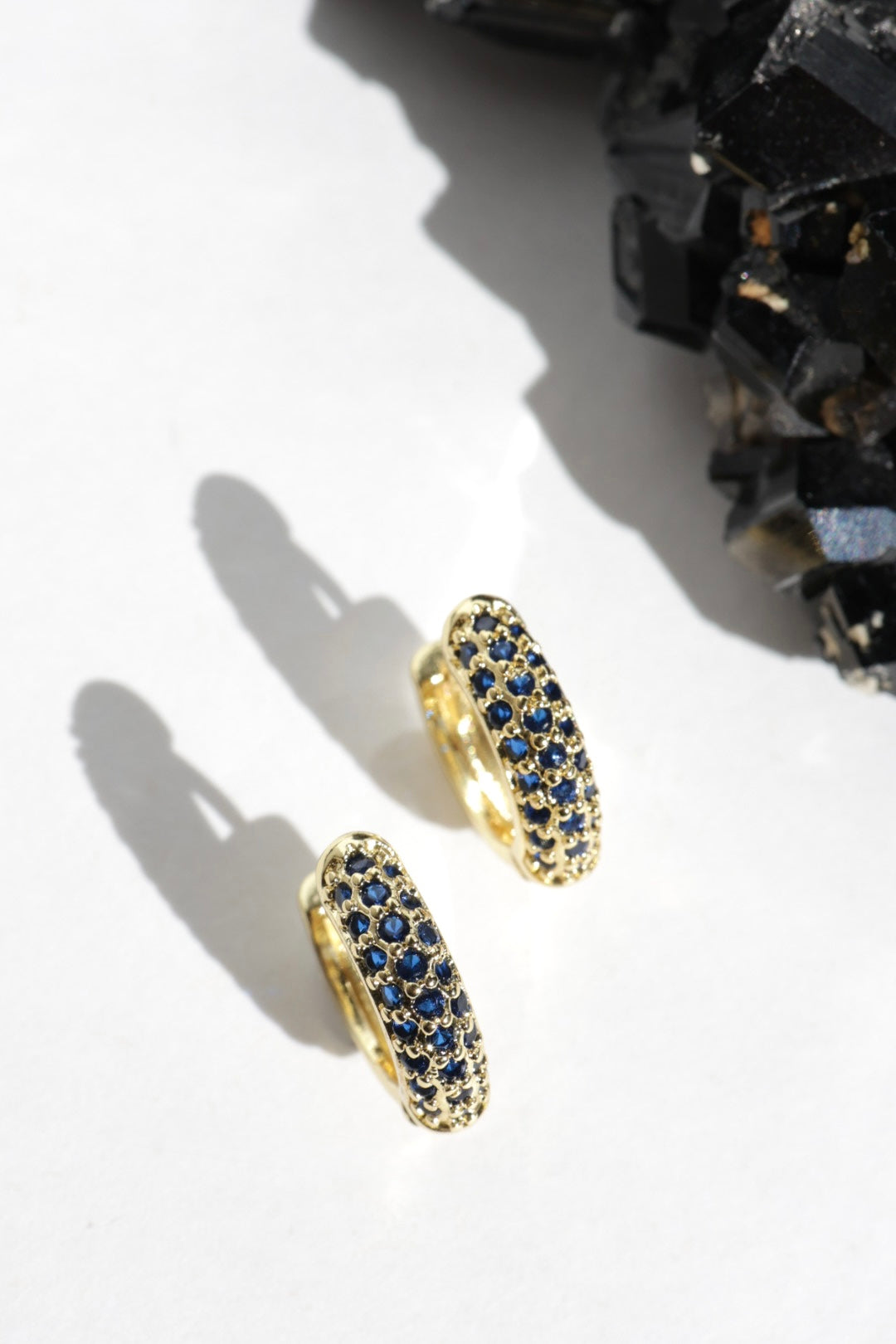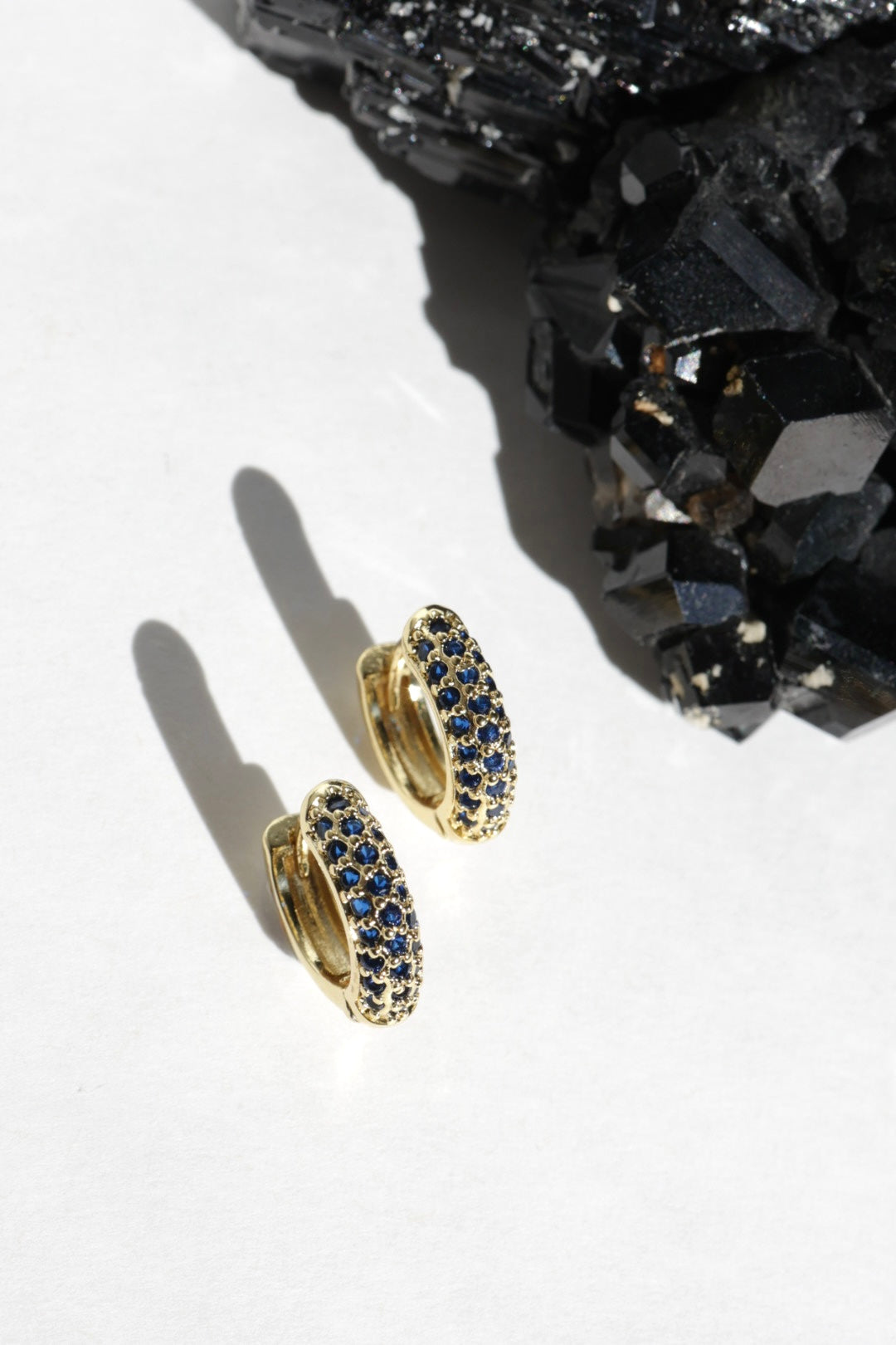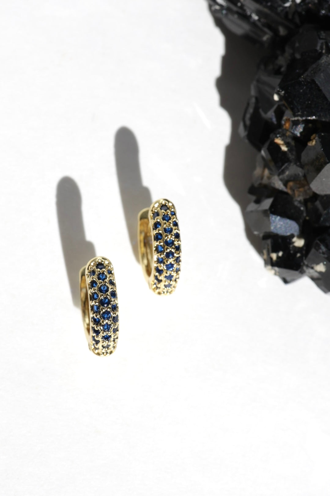 Three rows of deep blue kyanite are pavé set across the curved surface, creating a rich field of color that catches the light with subtle sparkle. The huggie silhouette hugs the ear closely while the softly rounded profile gives the stones room to glow.
