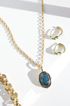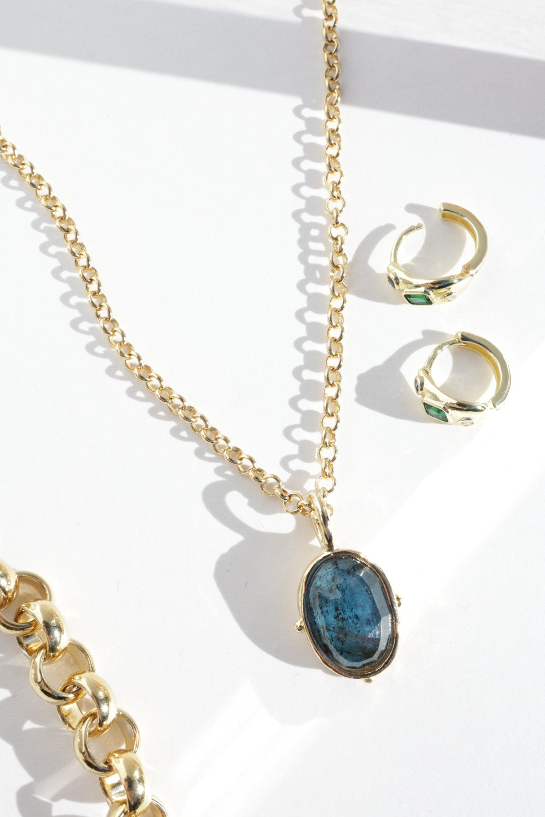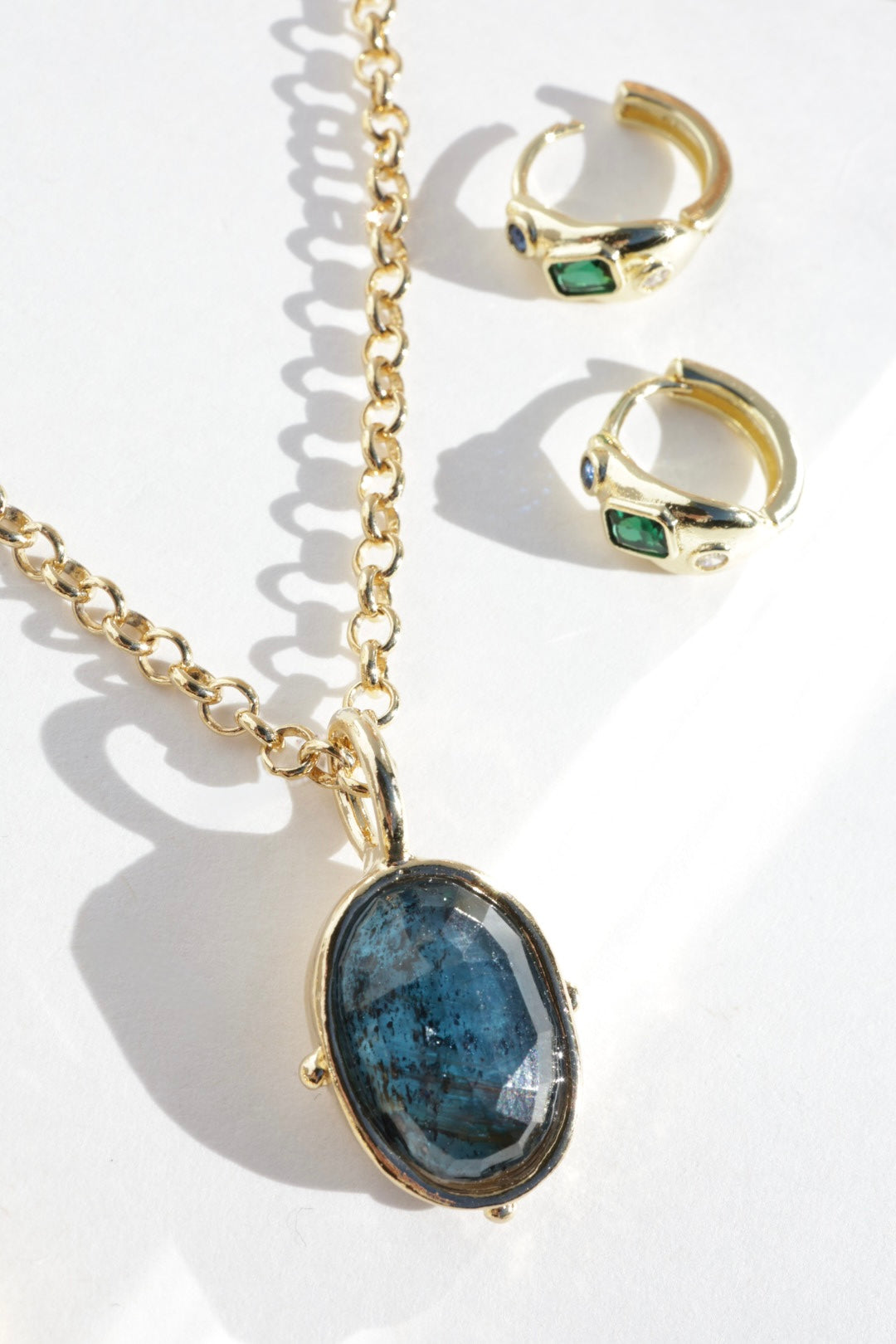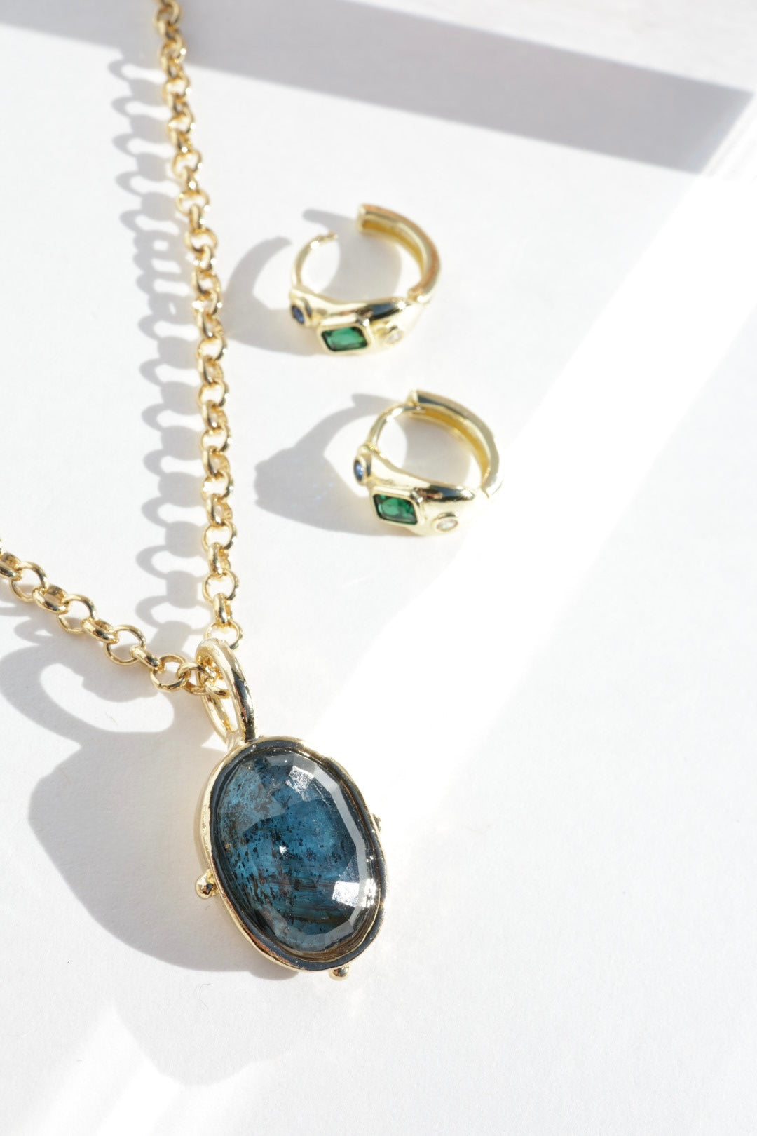 A faceted blue kyanite pendant that feels both ancient and quietly powerful. Clear and luminous with natural depth, the stone is framed in a Roman-inspired bezel accented with sculptural gold studs—details that give the piece its sense of history and strength.