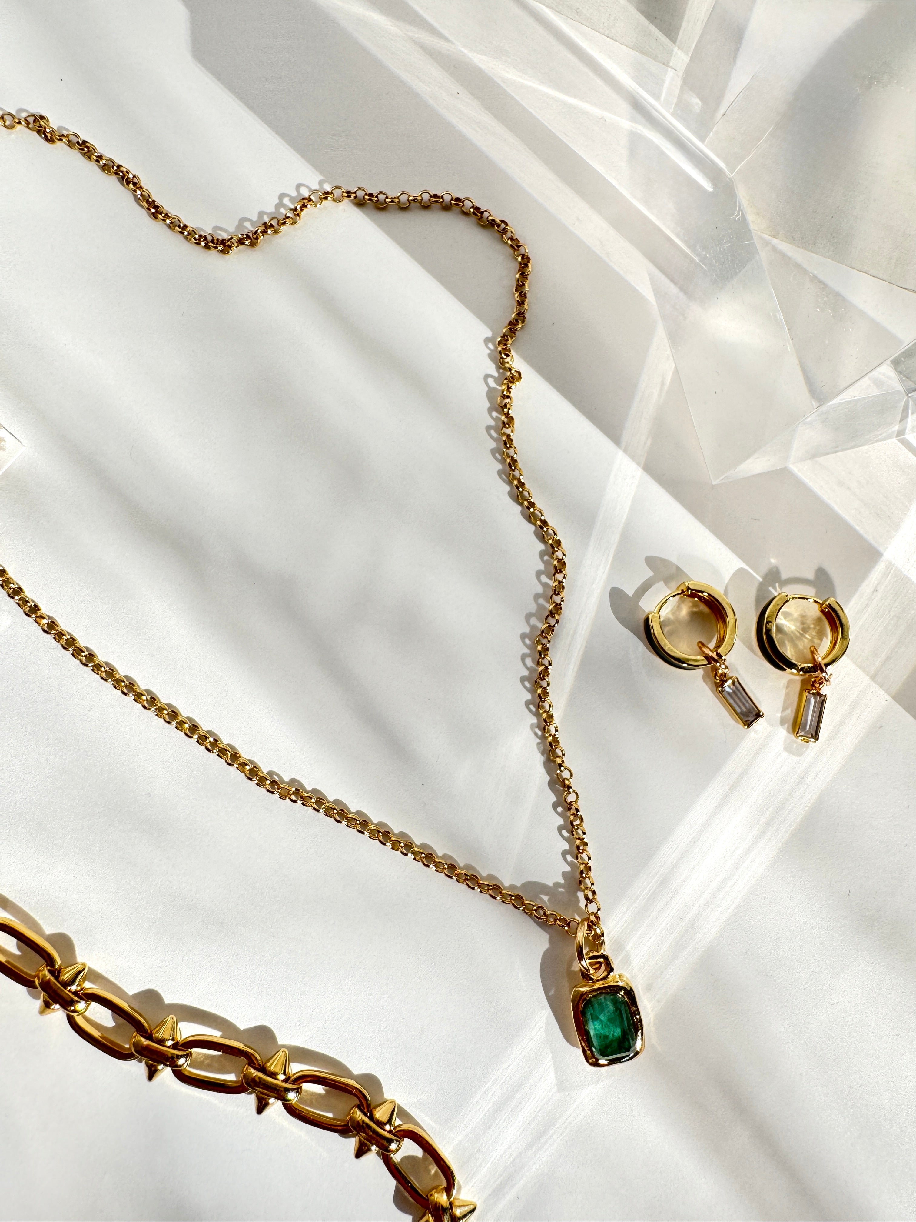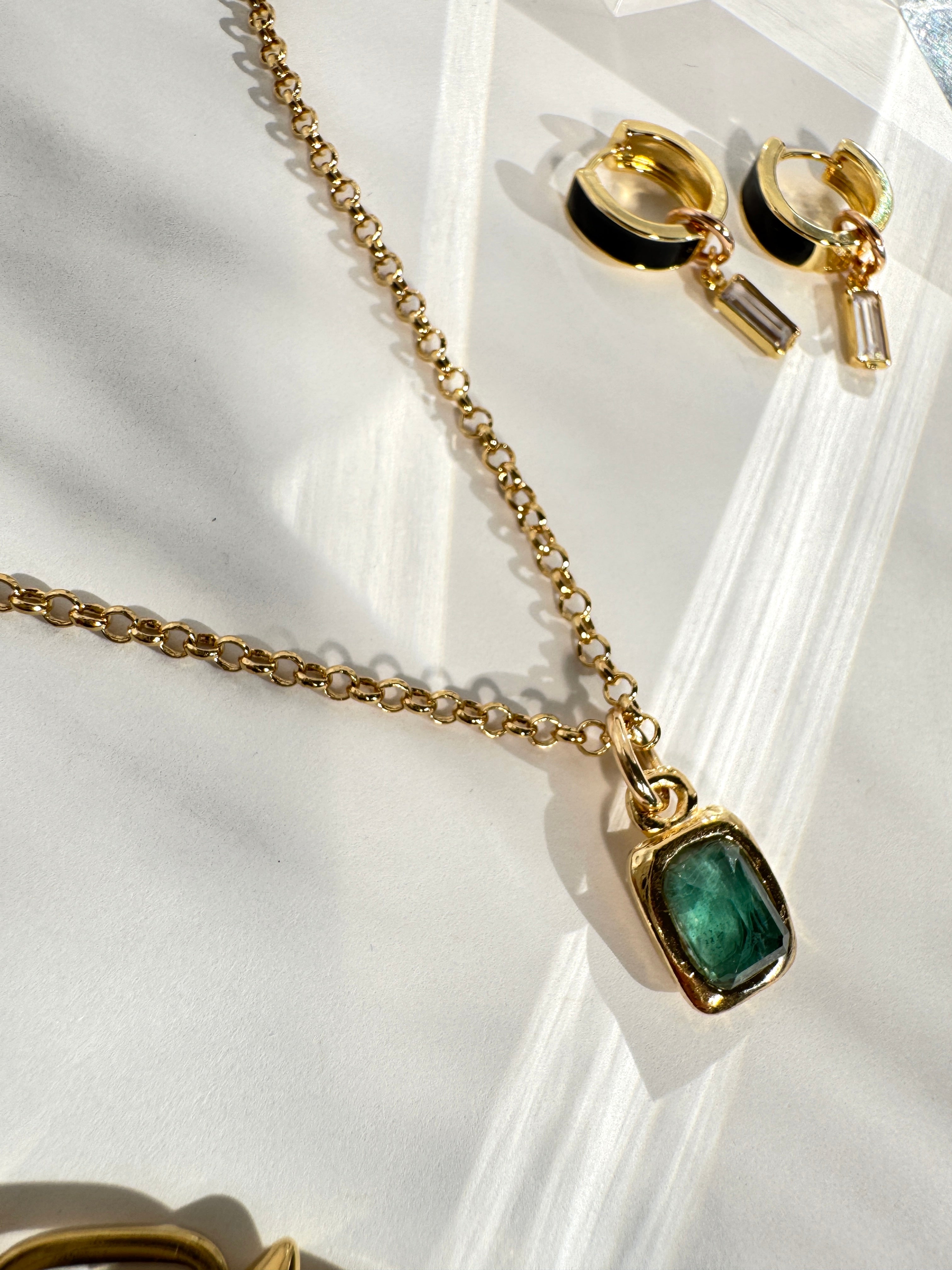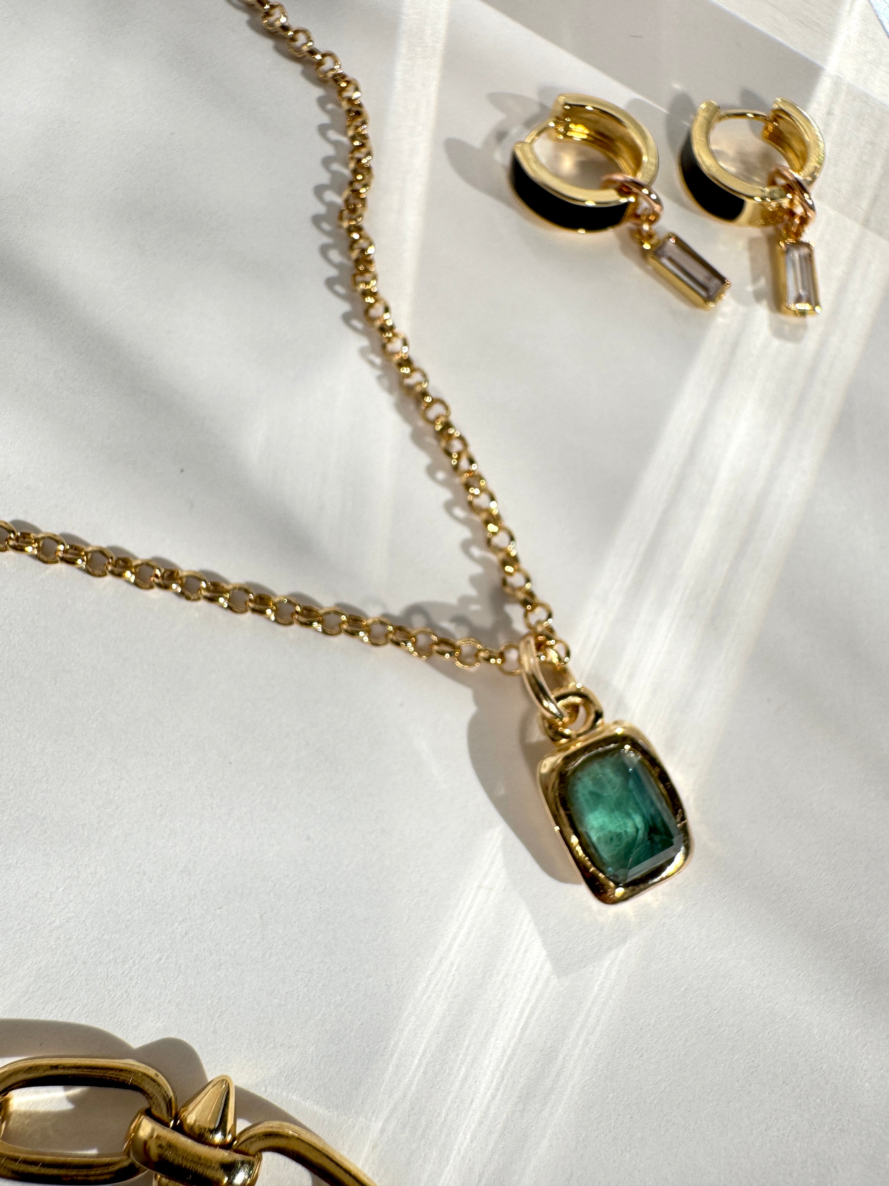 Handmade and one of a kind with a natural green tourmaline set in a small rectangle pendant 12mm x 9mm and comes on an 18" chain.