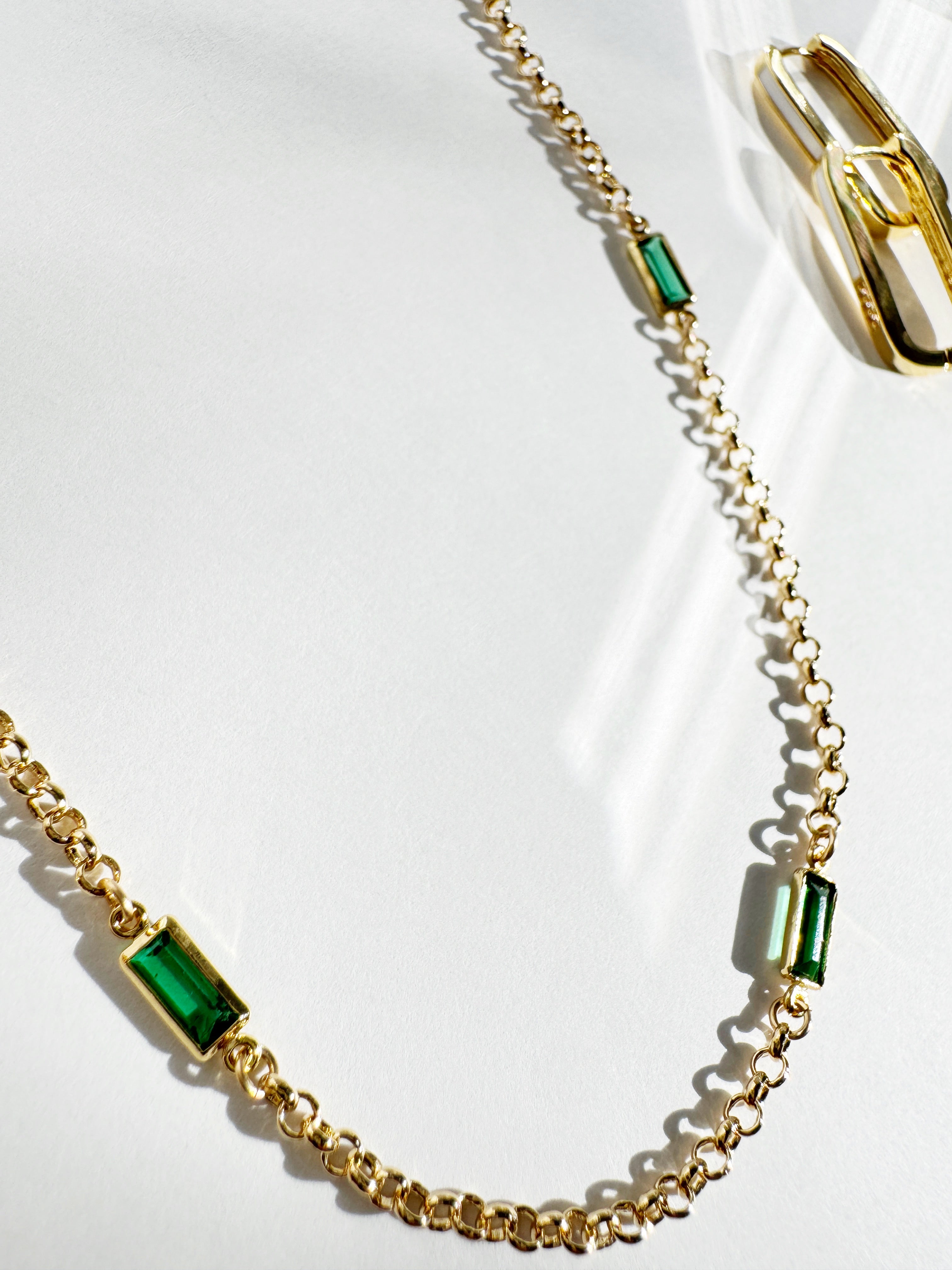 This necklace features tiny facetted rectangle green quartz baguette cut stones. This delicate piece is perfect for layering or wearing alone. This necklace makes getting ready easy and is perfect for anyone who loves green.