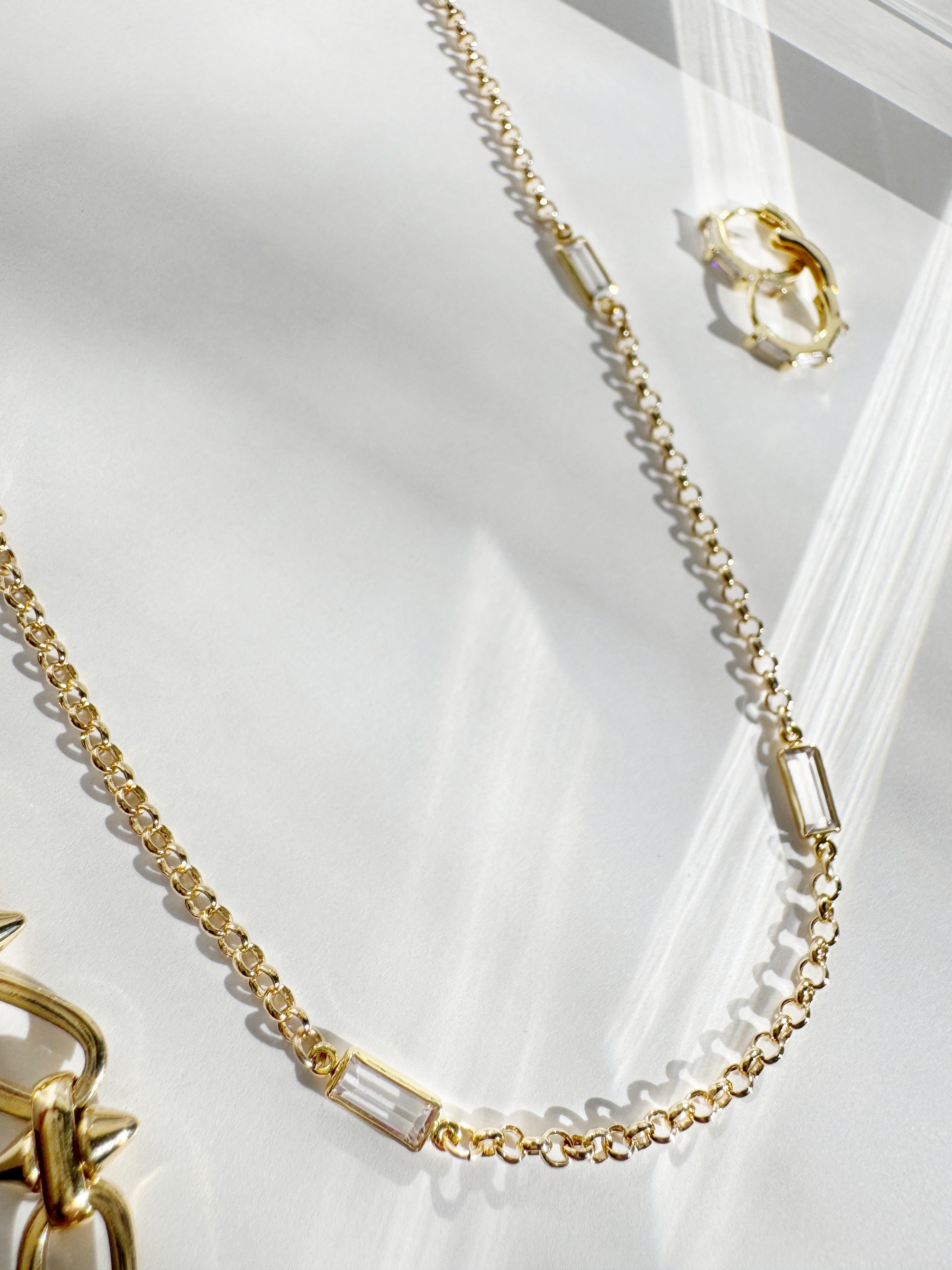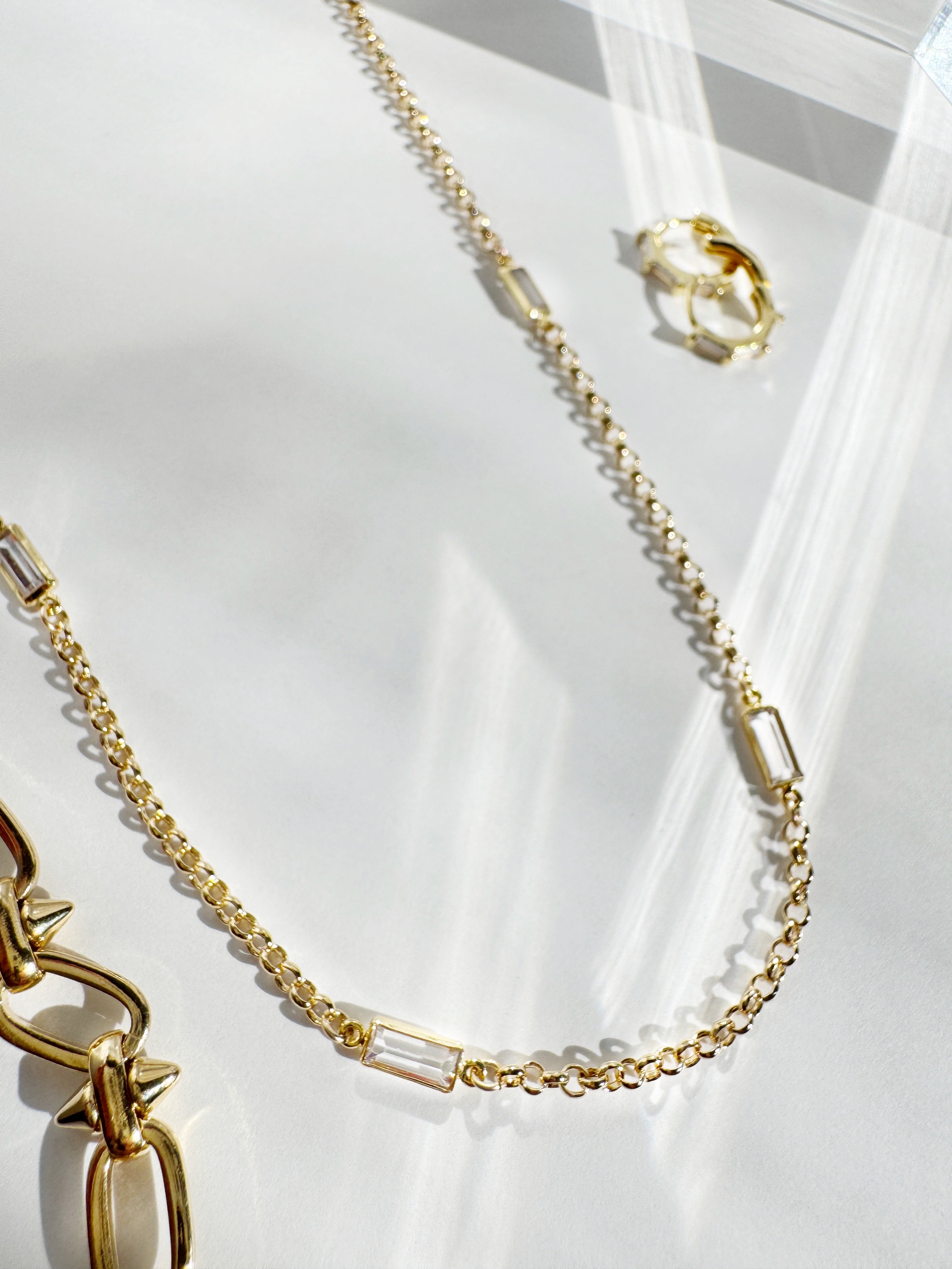 Tiny facetted rectangle clear quartz stones make this layering absolutely perfect for layering or wearing alone. This necklace makes getting ready easy.